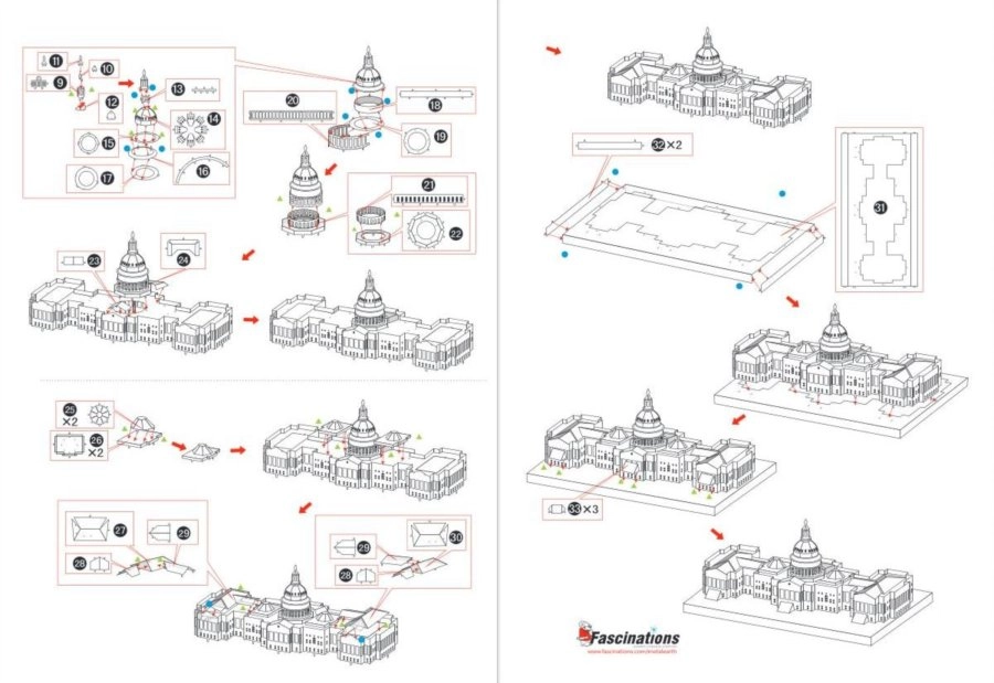 Il puzzle 3D METAL EARTH colpisce per la qualità costruttiva e i dettagli fedeli. Da due fogli d’acciaio da 11 × 11 cm separerai i pezzi che, tramite linguette e piegature, unirai in un imponente modello del Campidoglio. Il risultato è un elegante esemplare metallico lucido che delizierà collezionisti e amanti dell’architettura.
