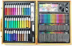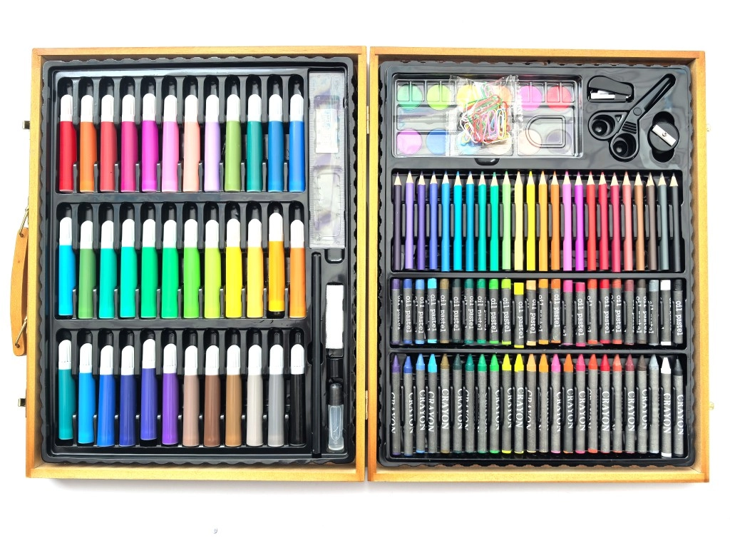 - 24 pastelli a cera, 24 pastelli a olio, 24 matite colorate, 12 acquerelli, tavolozza, 36 pennarelli, temperino, gomma, matita nera, spillatrice, forbici, colla, righello, 20 clip per carta