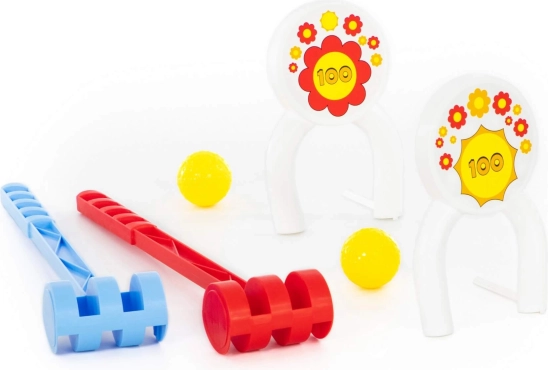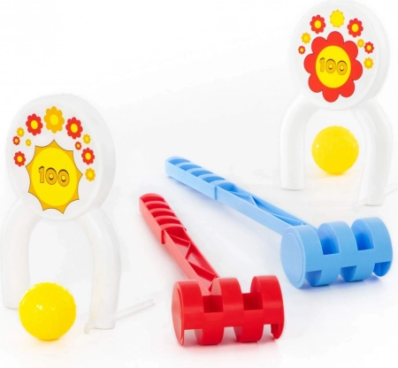 Il set contiene tutti i componenti necessari per un divertente gioco di croquet, inclusi due mallet, due palline gialle e archi con il numero 100.