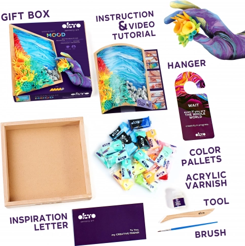 Set creativo OKTO 3D Oceano tranquillo: cornice in legno 21×21×5 cm, pasta, strumenti, pennello e vernice acrilica. Difficoltà 4/5. Crea il tuo quadro 3D.
