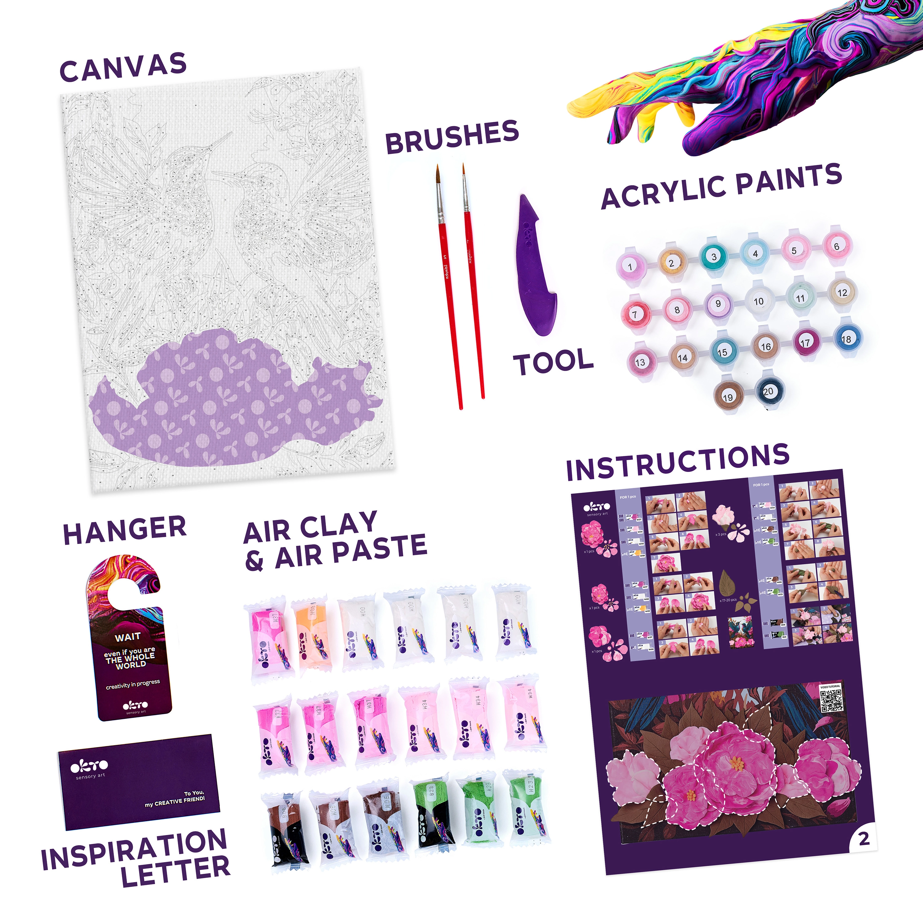 Il set è completo: contiene tutto il necessario, dalla tela e dai colori fino alla pasta modellabile e agli strumenti. È ideale come regalo creativo o come decorazione fatta a mano per la casa.