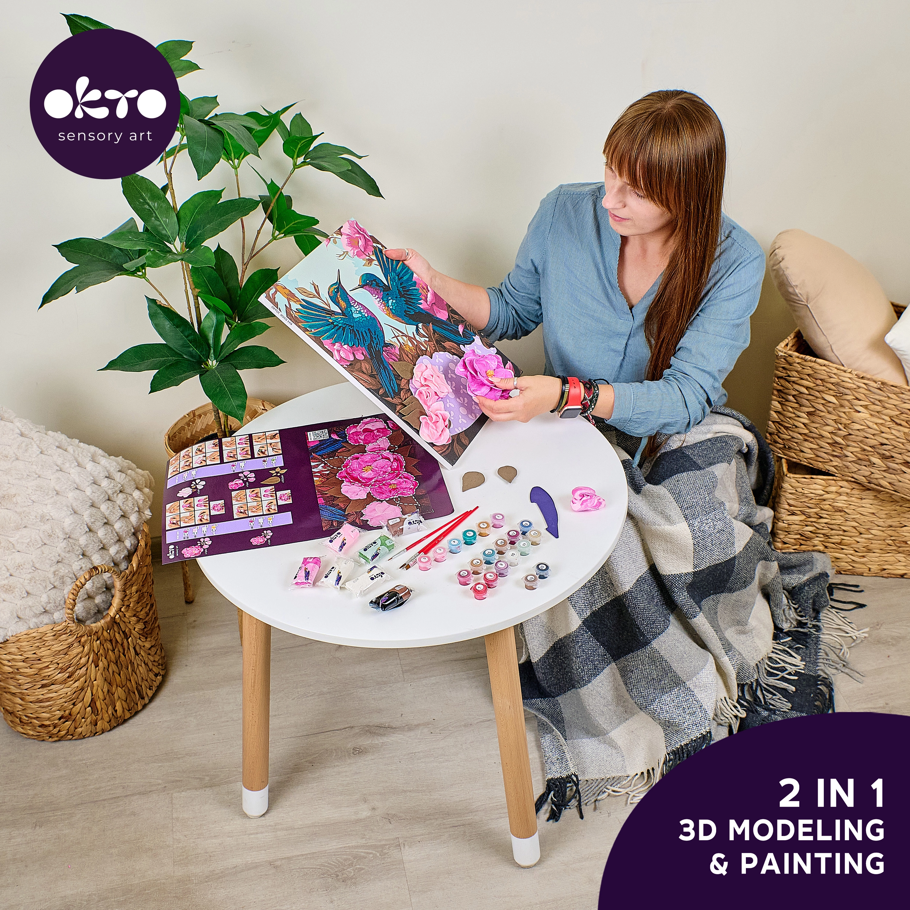 Il quadro “Hummingbirds in Love” unisce il rilassante dipingere per numeri a un divertente lavoro di modellazione 3D. Grazie alla chiara marcatura della tela e alle istruzioni incluse, potrai dipingere passo dopo passo un motivo dettagliato e successivamente modellare elementi selezionati per un suggestivo effetto di profondità.
