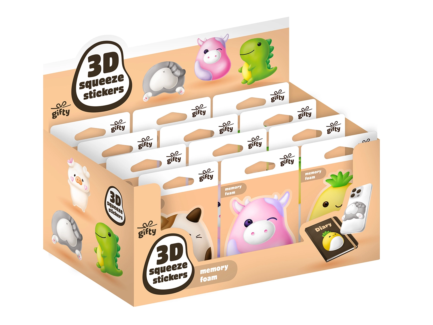 Scopri i Gifty adesivi 3D schiacciabili, belli da vedere e divertenti al tatto. La morbida schiuma memory è piacevole da giocare e schiacciare, mentre il retro autoadesivo permette una facile applicazione su telefono, quaderno, agenda e astuccio. La confezione contiene 15 adesivi in tre motivi adorabili: mucca, ananas e gattino.