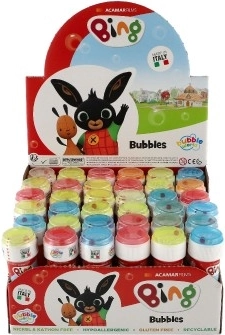 Divertente bolle di sapone per bambini con i personaggi animati di BING, porta tanta gioia all’aperto e in casa. Contiene 60 ml di soluzione e nel tappo ha un mini rompicapo per ancora più divertimento. Adatto per bambini dai 3 anni. I colori e i motivi sono forniti in mix secondo disponibilità di magazzino.