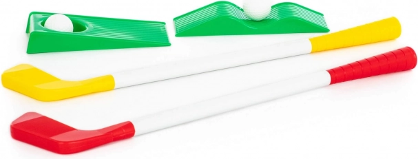 Il set per bambini include mazze di plastica con testine rosse e gialle, leggere e facili da maneggiare.