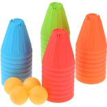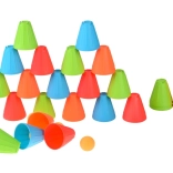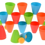 I bicchieri possono essere usati come gioco di abilità – i bambini possono costruire torri e piste, spostare o capovolgere i bicchieri a tempo, oppure lanciare le palline leggere verso bersagli contrassegnati. Il gioco favorisce la coordinazione occhio–mano, la concentrazione e i riflessi, e allo stesso tempo sviluppa il pensiero creativo nell’ideare costruzioni e sfide originali.