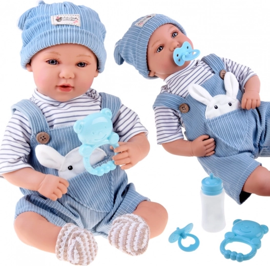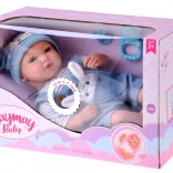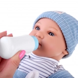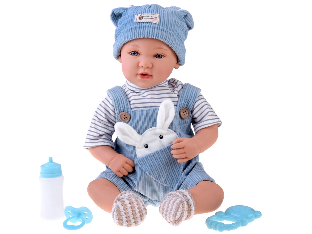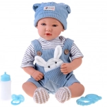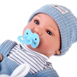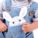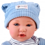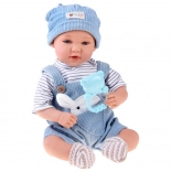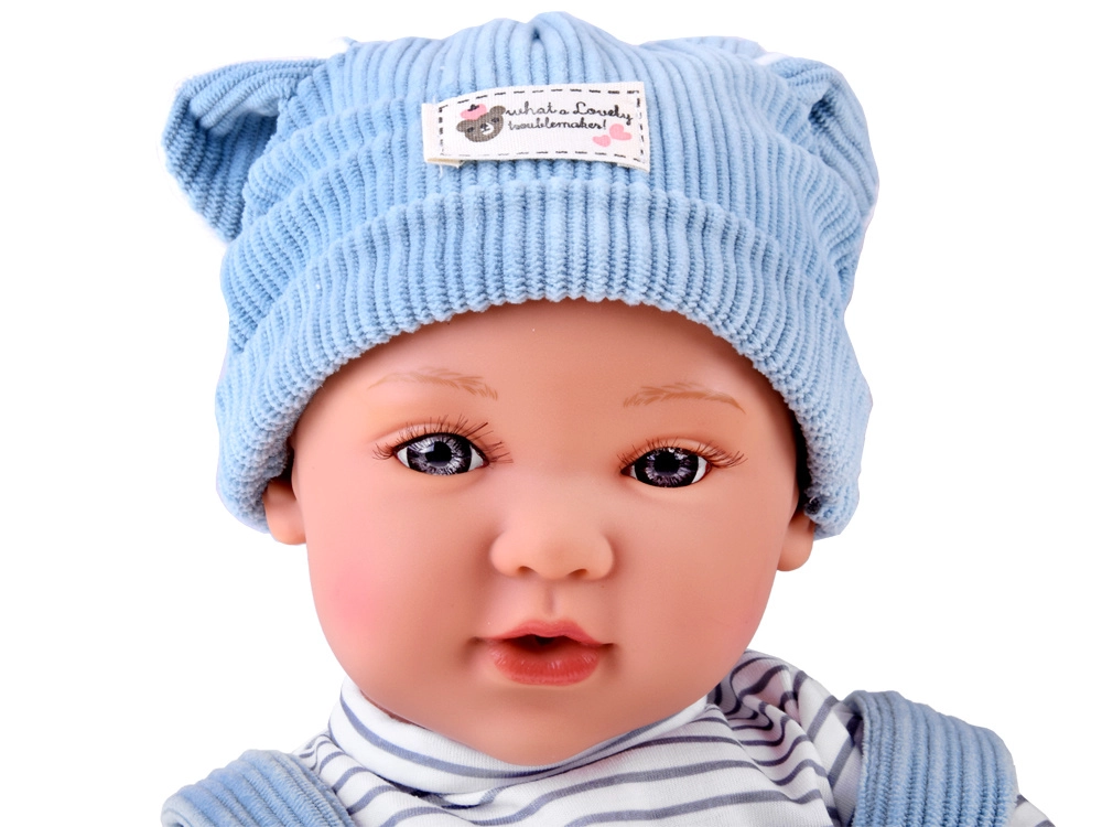 La bambola interattiva tipo bebè colpisce per i tratti del viso realistici, le ciglia lunghe e gli occhi espressivi. Ha un corpo morbido per facili coccole e testa e arti in plastica per resistere al gioco quotidiano. L’outfit alla moda in velluto blu a coste si abbina alla perfezione con la maglietta a righe e il cappellino lavorato a maglia.