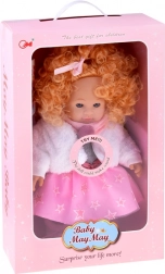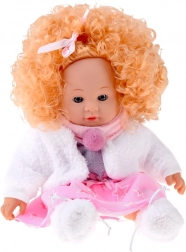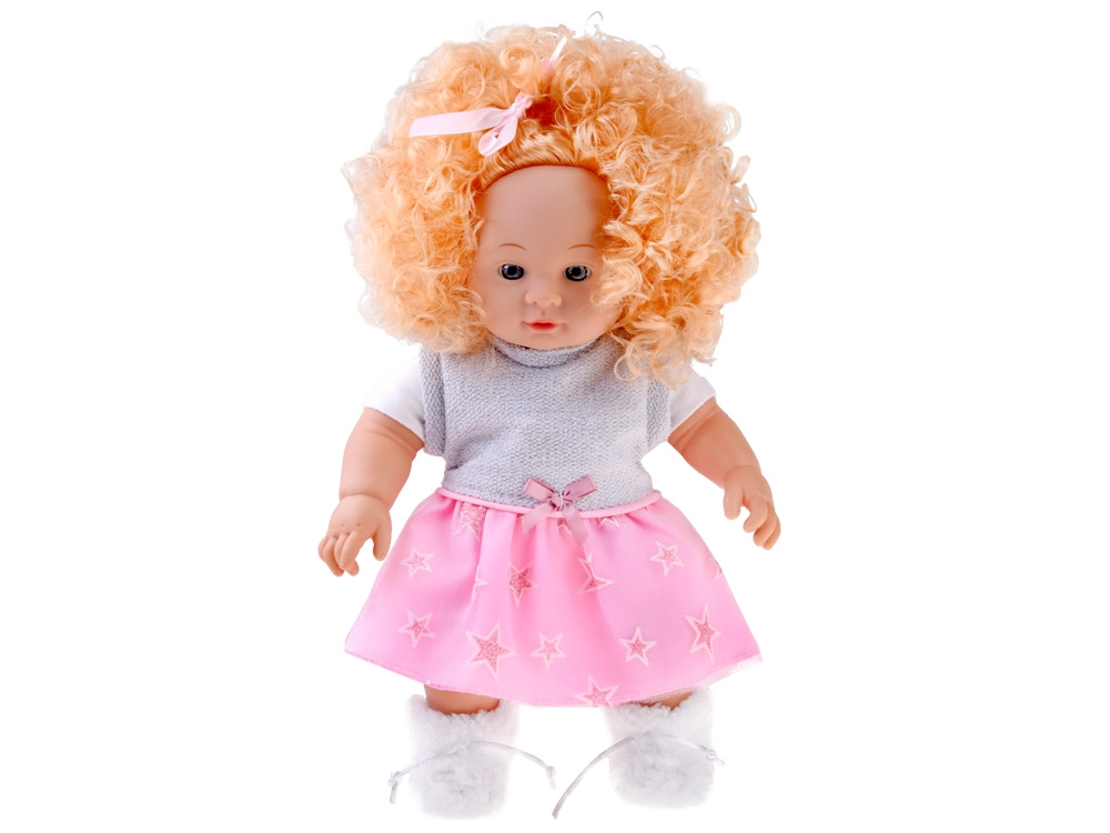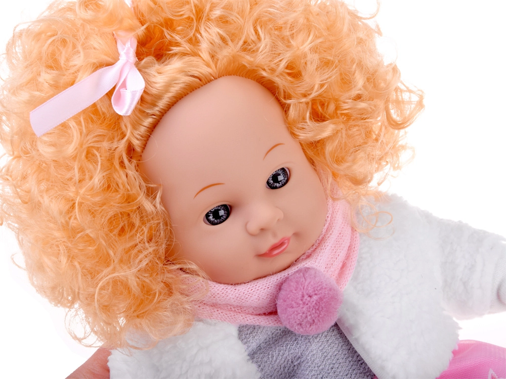 Incluso un outfit invernale: vestitino rosa‑grigio con stelline, soffice cappottino bianco, sciarpa rosa con pon pon e morbide pantofole. Il modulo sonoro integrato riproduce diversi versi infantili, rendendo il gioco ancora più interattivo e realistico.