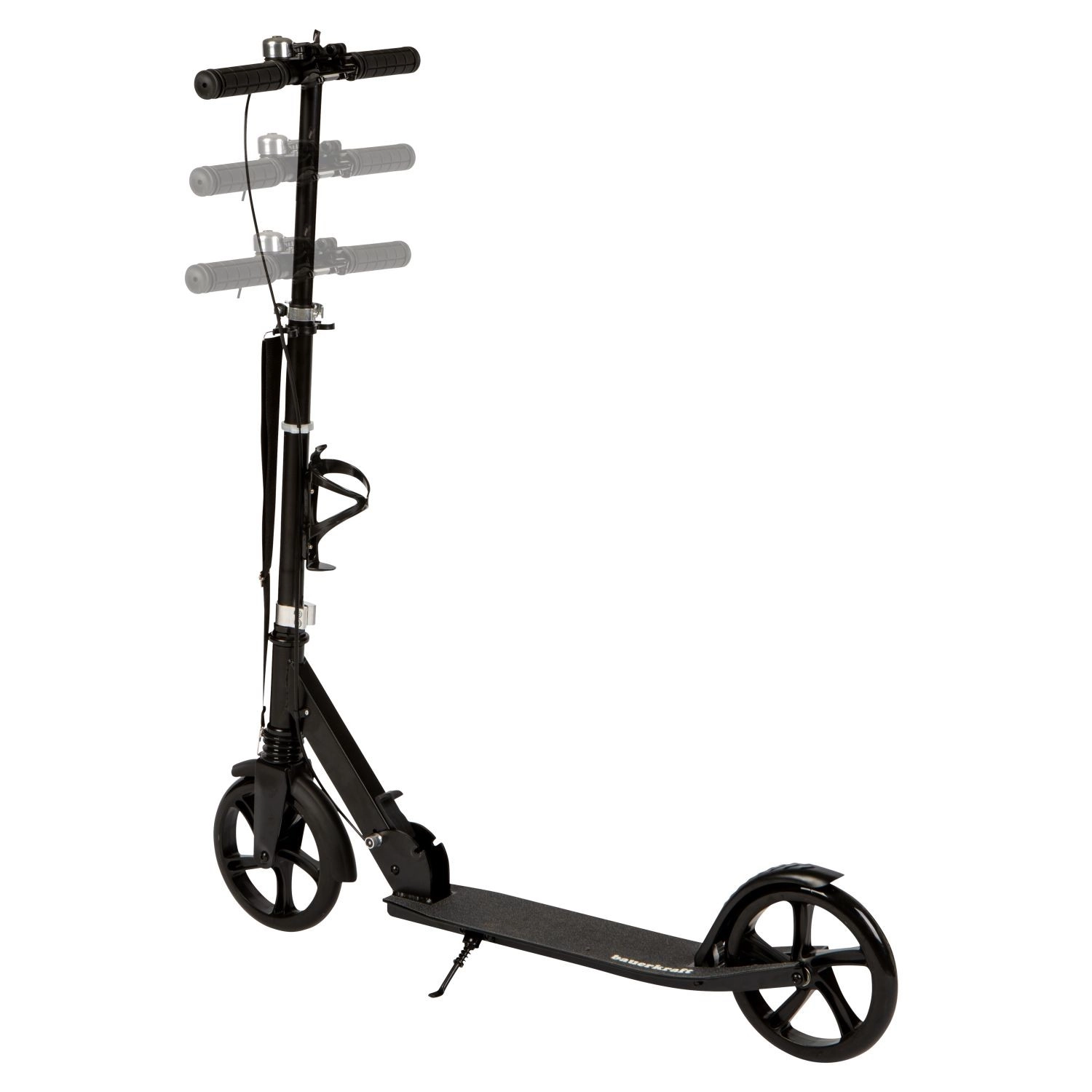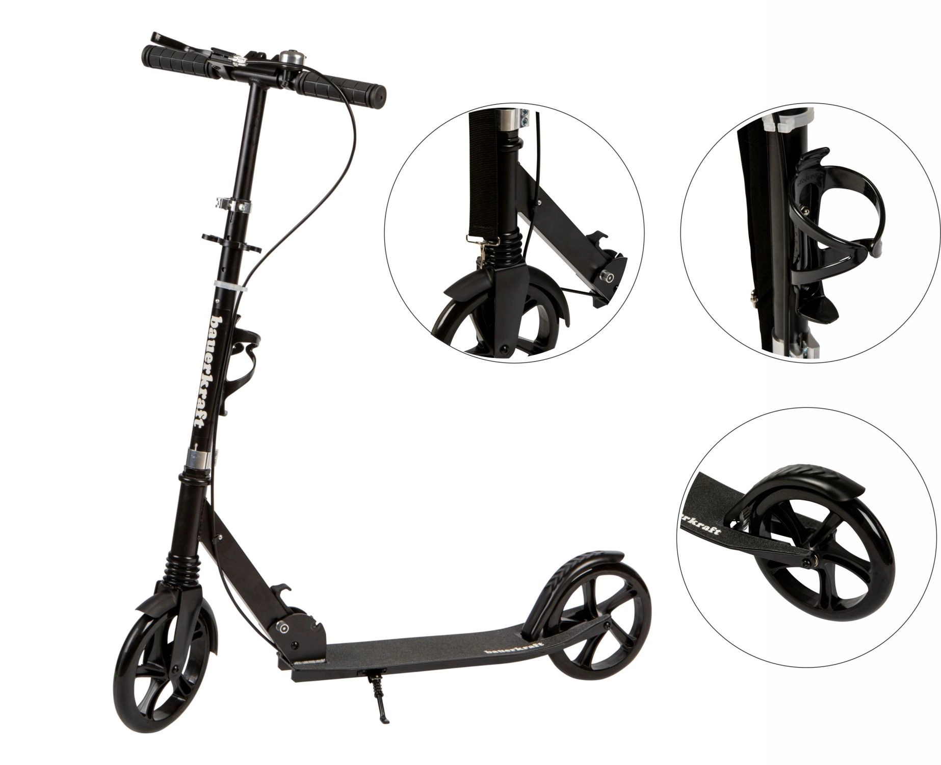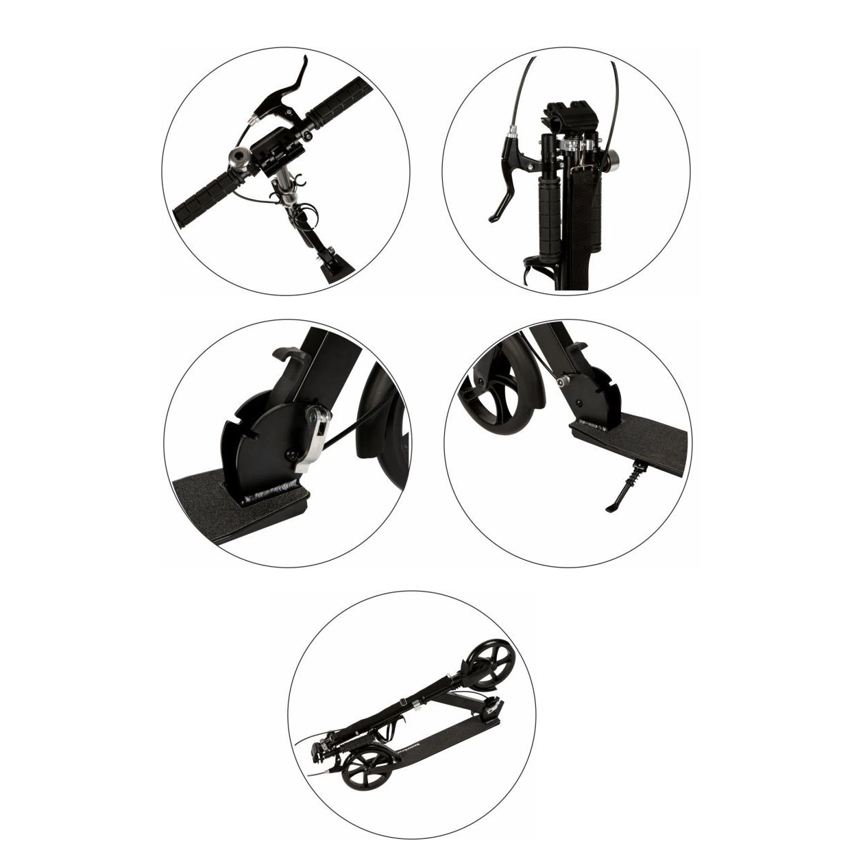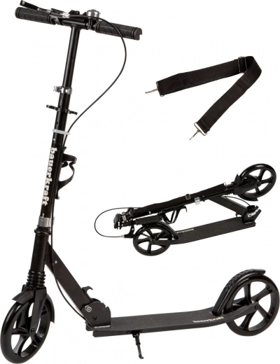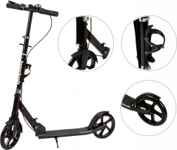 Leggero monopattino urbano in alluminio per bambini e adolescenti, dotato di grandi ruote da 200 mm con cuscinetti ABEC-7, manubrio regolabile 95–105 cm, sospensione anteriore e telaio pieghevole. Per una guida sicura non mancano freno a mano e freno a pedale, pedana antiscivolo, cavalletto, campanello e pratico portaborraccia. Portata massima 80 kg.