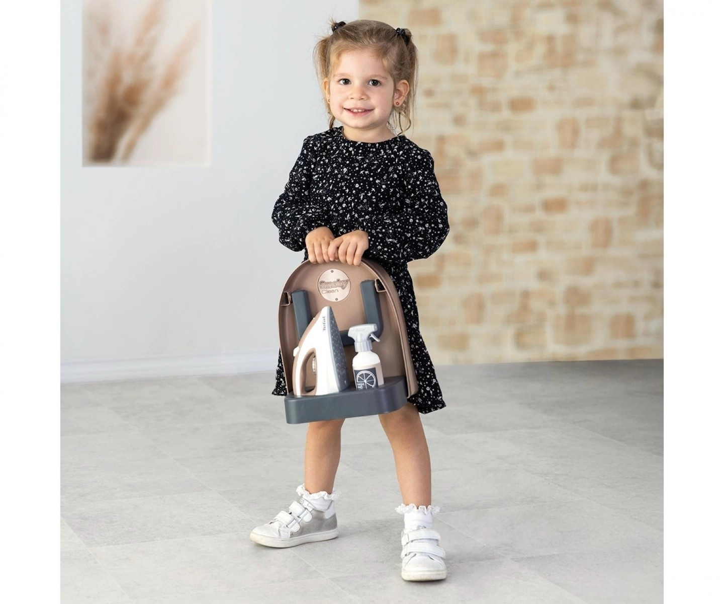 Il ferro in plastica con pulsante che emette il suono “click-click” e il vaporizzatore per bambini aumentano l’autenticità del gioco da stiro.