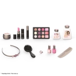 - 13 accessori – finti: 2 smalti per unghie, 2 rossetti, palette di ombretti, mascara, spazzola, pettine, cerchietto, anellino e varie boccette