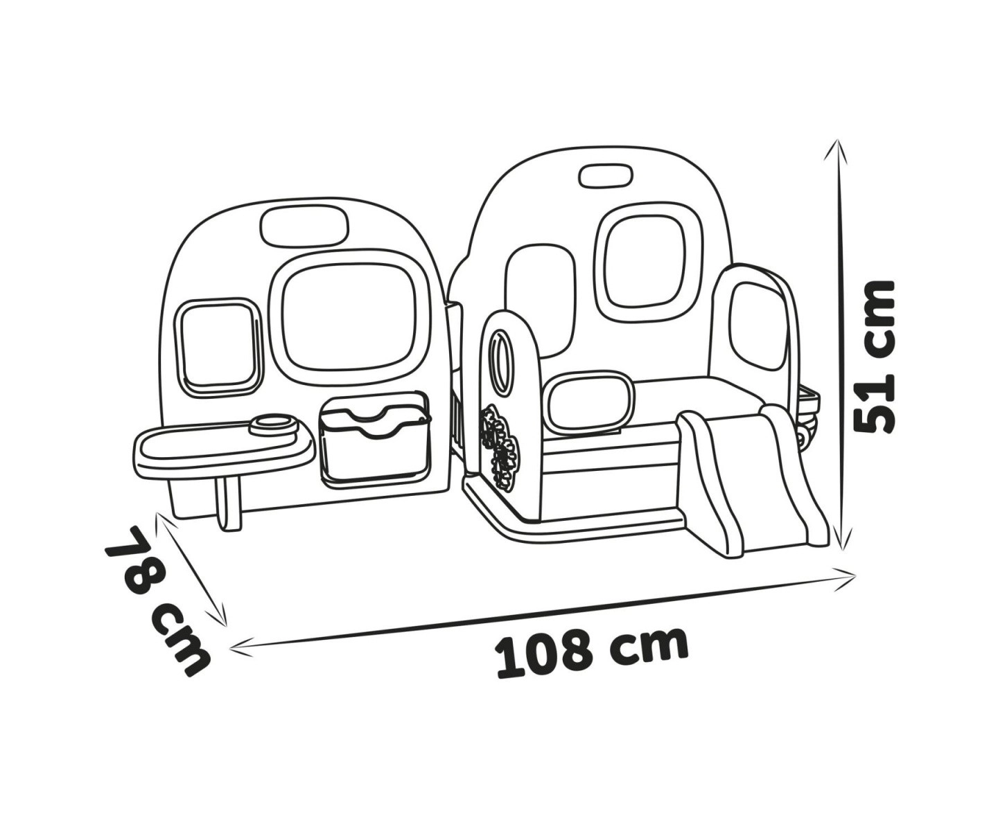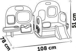 Include un piccolo bagno con WC, lavandino e portacarta igienica, un letto a castello separato con scivolo per il riposino pomeridiano, una zona pranzo e creativa con una piccola lavagnetta cancellabile a secco e una cassapanca per riporre gli accessori. Dopo il gioco, l’intero centro si piega facilmente e, grazie alla maniglia, si trasporta o si ripone comodamente.