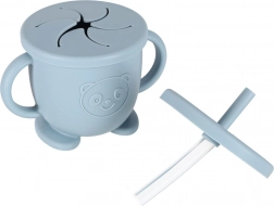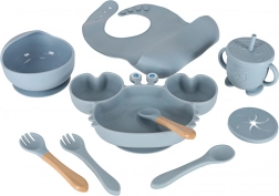 - Dotazione completa: piatto con 3 scomparti, ciotola, tazza con 2 coperchi + cannuccia, 2× cucchiaio, 2× forchetta, bavaglino regolabile