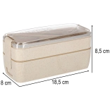 - contenitore inferiore, contenitore superiore, coperchio intermedio/divisorio tra i livelli, divisorio scorrevole, coperchio con guarnizione in silicone e due clip, 1× forchetta, 1× cucchiaino