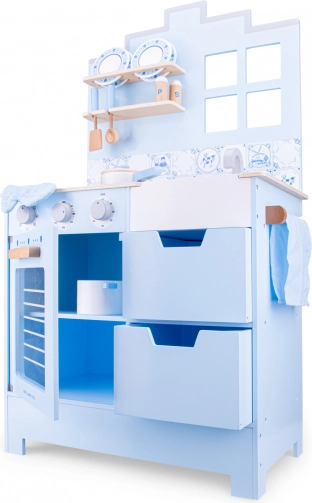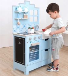 Questa raffinata cucinina per bambini in azzurro crea lo spazio ideale per il gioco fantasioso della cucina. Non mancano lavello con rubinetto, forno con finestra, forno a microonde e numerosi ripiani e cassetti per riporre gli accessori. I dettagli realistici, come le manopole girevoli, lo sportello del forno e gli utensili appesi, stimolano i sensi e favoriscono l'autonomia.