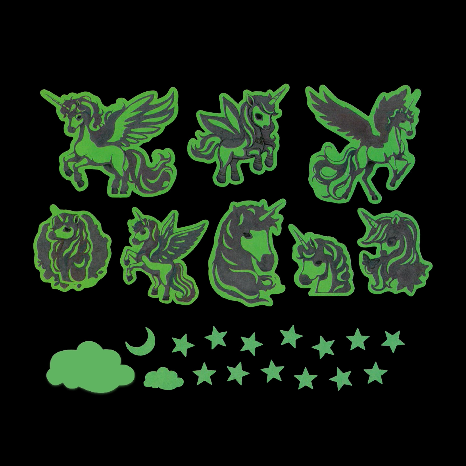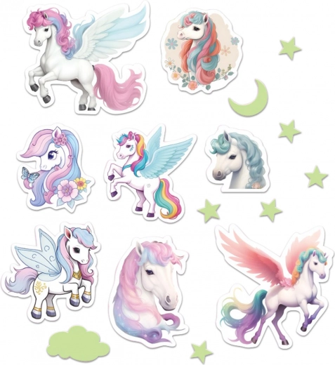 Crea un’atmosfera magica con la decorazione adesiva con unicorni. Di giorno rallegra con colori vivaci e di notte fosforesce delicatamente, aiutando i bambini a sentirsi più tranquilli e al sicuro.