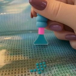 La vaschetta scanalata, l’applicatore e la cera assicurano un prelievo e un posizionamento precisi delle pietrine nei punti corretti secondo i simboli sulla tela.