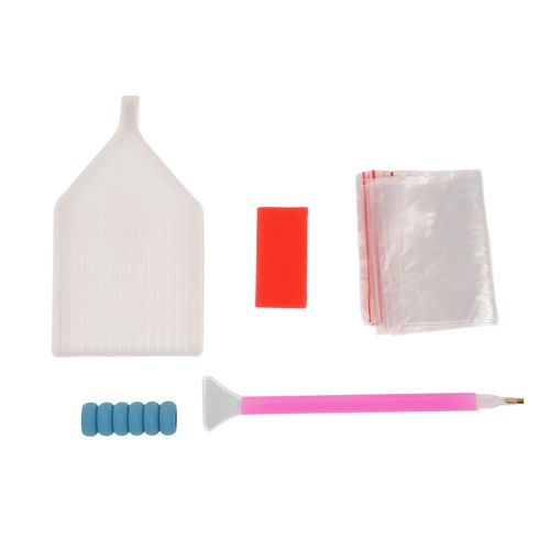 La confezione include tela adesiva, pietrine colorate in bustine, applicatore con impugnatura, cera e vaschetta di smistamento: puoi iniziare subito a creare.