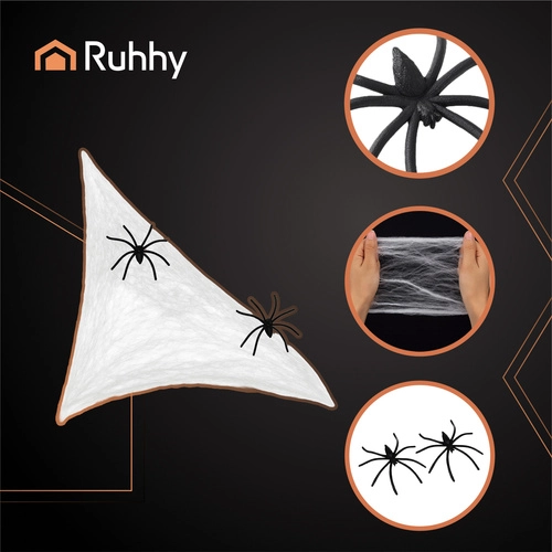 Trasforma la tua casa o lo spazio della festa in un covo misterioso. La ragnatela bianca RUHHY con due ragni neri offre un effetto visivo marcato e crea un'atmosfera di paura e divertimento. Grazie al materiale elastico, puoi modellarla e stenderla facilmente su vari oggetti, dalle porte e corrimani all'illuminazione e alle decorazioni da tavolo.