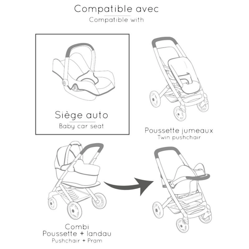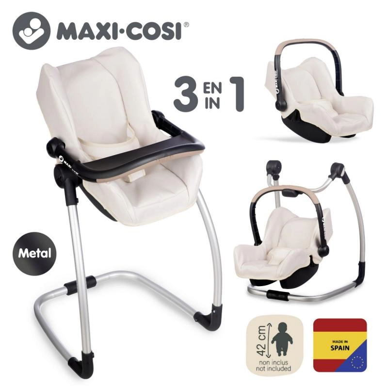 Questo set multifunzionale per bambole combina tre funzioni popolari in un unico prodotto: seggiolino auto per un facile trasporto, seduta a dondolo quando appesa alla struttura e stabile seggiolone alto quando la si ruota. Ideale per un gioco realistico e per stimolare la fantasia dei bambini.