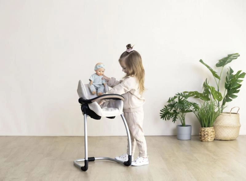 Pratico set per bambole 3 in 1 che funge da seggiolino auto, altalena e seggiolone alto. Si trasforma facilmente ruotando la struttura, è adatto a bambole fino a 42 cm e conquista con il moderno design beige.