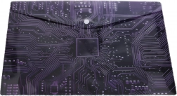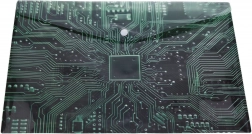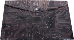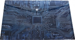 Questa elegante busta in plastica con bottone a pressione, dimensioni 35 × 25 cm, è ideale per l’uso quotidiano a scuola, in ufficio e a casa. Il materiale traslucido con pattern tecnico ispirato alla scheda madre ha un aspetto moderno e aiuta a riconoscere rapidamente il contenuto.