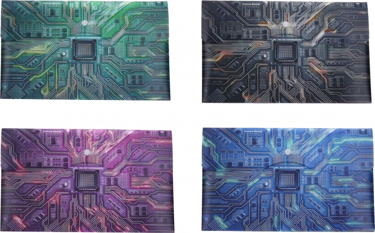 Tieni i tuoi fogli ordinati e al sicuro. Questa resistente cartellina in plastica con motivo della scheda madre e scritta “Future Ready” offre la perfetta combinazione di funzionalità e design moderno. Il formato A4+ contiene senza problemi fogli standard e materiali leggermente più grandi, mentre la chiusura a pressione affidabile impedisce la fuoriuscita accidentale dei documenti.