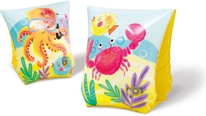 I braccioli presentano illustrazioni giocose di meduse, polpi e granchi in colori vivaci su uno sfondo giallo, incoraggiando i bambini a nuotare.