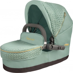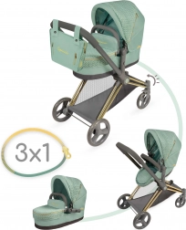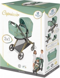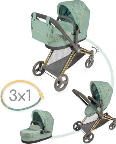 Elegante passeggino per bambole 3 in 1 della collezione CAPRICCIO in moderno color verde menta, offre navicella profonda, seduta sportiva e culla portatile. Dispone di capottina regolabile, ruote anteriori piroettanti per una manovrabilità agevole, cestello portaoggetti e borsa rimovibile con cerniere dorate. Grazie alla struttura pieghevole non occupa spazio ed è ideale per bambini dai 3 anni in su.