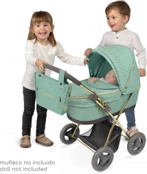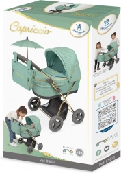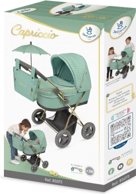Scopri il passeggino per bambole della collezione Capriccio 2025 con inconfondibile colore verde menta e raffinati dettagli dorati. La combinazione di tessuto effetto maglia e tessuto liscio dona un look lussuoso, mentre il telaio leggero e il manico più basso garantiscono un controllo confortevole anche per i bambini più piccoli.