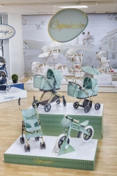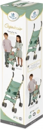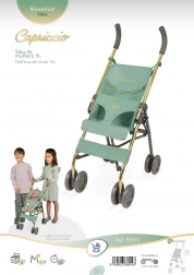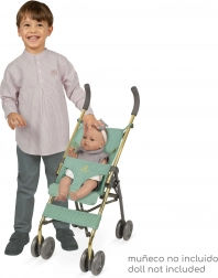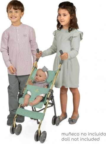 Elegante e pratico passeggino pieghevole per bambole della collezione CAPRICCIO in moderno colore verde menta, offre maneggevolezza facile, struttura metallica stabile e cintura a tre punti per fissare la bambola in sicurezza. Grazie alle dimensioni compatte è ideale in viaggio e in casa.