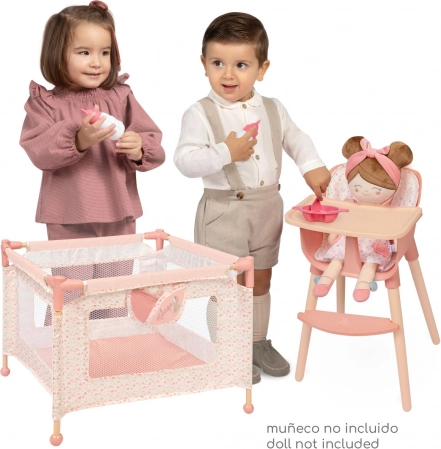 L’elegante set per bambole DeCuevas Tulipe 2 in 1 unisce un box da gioco e un seggiolone in delicate tonalità pastello con motivo di tulipani. Offre lavorazione precisa, facile maneggevolezza ed è ideale per bambole fino a 36 cm. Un accessorio perfetto per la cameretta con un meraviglioso design spagnolo.