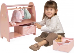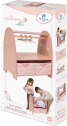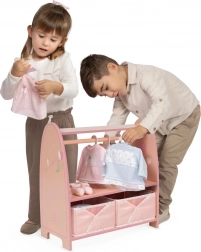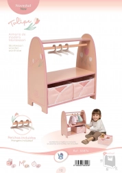 L’elegante appendiabiti in legno per vestitini delle bambole con delicato motivo di tulipani si integra perfettamente nella cameretta dei bambini. Offre una barra appendiabiti con grucce, una mensola e due cestini pieghevoli per riporre in modo ordinato gli accessori. Grazie alla lavorazione in legno di qualità e ai colori pastello è ideale per il gioco quotidiano e per organizzare il guardaroba delle bambole.