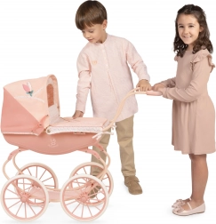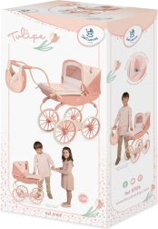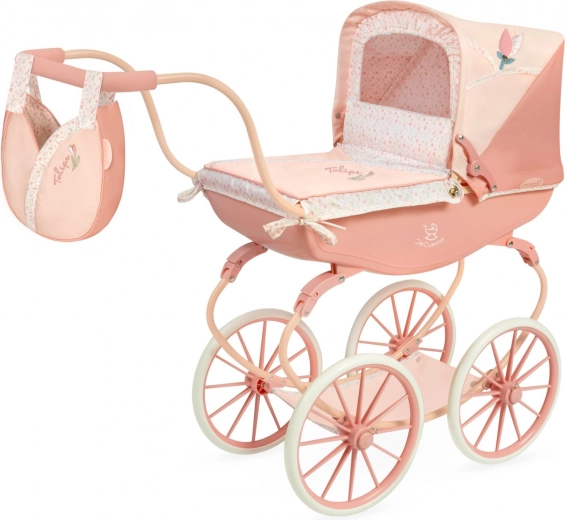La carrozzina per bambole della collezione Tulipe 2025 si distingue per la lavorazione accurata e la splendida combinazione di tonalità salmone pastello più chiare e più scure con un delicato motivo floreale. Grazie alle molle per il dondolio e al materassino morbido, offre alla bambola un comodo “sonno”, mentre la capottina richiudibile e il copri-navicella la proteggono durante le passeggiate.