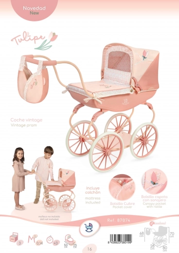 Elegante passeggino per bambole DeCuevas Tulipe con altezza al manico di 68 cm, impreziosito da un meraviglioso design spagnolo in calde tonalità pastello. Offre una capottina richiudibile, sospensioni a molla per dondolio, una borsa rimovibile a forma di tulipano e un pratico vano portaoggetti per gli accessori. Ideale per bambini dai 3 anni e per gli amanti dei complementi d’arredo stilosi per la cameretta.
