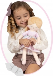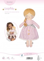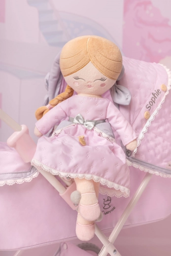 La collezione SOPHIE 2025 si distingue per il look romantico in un tenue rosa, arricchito da pizzi e fiocchetti in grigio chiaro e bianco. La bambola è confezionata in un involucro protettivo, pronta per essere regalata.