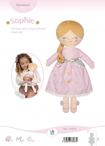 Dolcissima bambola di peluche Sophie 36 cm della collezione 2025. Morbida, leggera, lavabile a 30 °C, design spagnolo. Ideale per bambini dai 12 mesi.