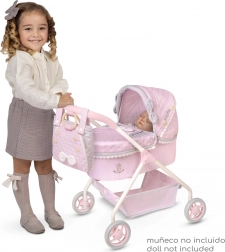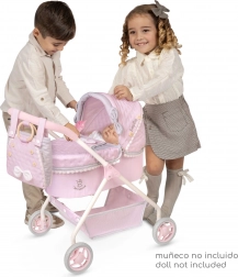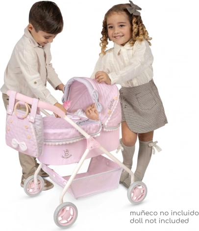 La dotazione pratica comprende una borsa rimovibile da agganciare al passeggino o da portare a mano, copertura della navicella con occhielli e taschine, comodo materassino e vano portaoggetti inferiore per piccoli accessori. Il design spagnolo e la lavorazione precisa garantiscono lunga durata e divertimento quotidiano.