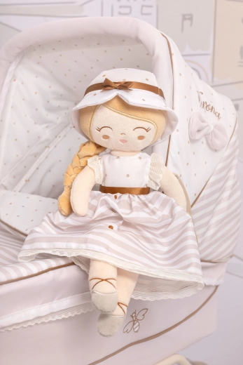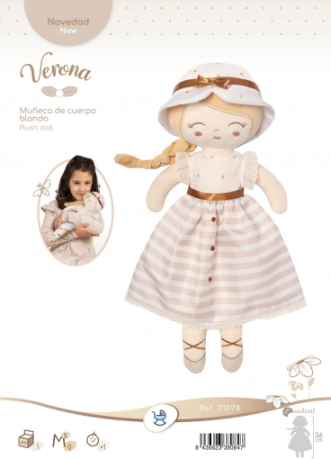 La bambola di peluche Verona 36 cm è una piccola amica ispirata a tonalità naturali e motivi discreti, dal fascino senza tempo. La combinazione di beige chiaro e bianco con pois o righe, completata da un bordo sottile, sottolinea l’elegante design spagnolo. La bambola è realizzata in peluche liscio e lucido di alta qualità, piacevole al tatto e adatto al gioco quotidiano.