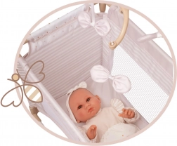 Questa raffinata culletta per bambole nei toni pastello beige e bianco completa con stile ogni cameretta. Combina un look naturale con dettagli adorabili come pois, righe e fiocchetti discreti che ricordano petali di fiori. La lavorazione di qualità e la struttura stabile assicurano un gioco sicuro e confortevole.