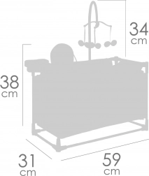 È compreso tutto ciò di cui hanno bisogno le piccole mamme: una giostrina per intrattenere la bambola, un fasciatoio per la cura, una seggiolina con biberon, ciotolina e posatine e un pratico armadietto con zip e appendini. La parte letto con finestrina in rete permette ai bambini di avere sempre la bambola in vista e la base ampia garantisce comfort durante il gioco.