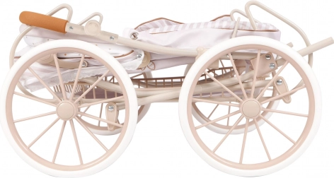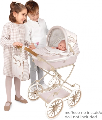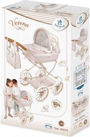 La collezione Verona colpisce per la delicata combinazione di beige chiaro e bianco con sottili righe e pois, completata da eleganti fiocchetti e piccole ricamature. Il passeggino è progettato per trasportare le bambole in modo confortevole e per una facile maneggevolezza, e si ripiega facilmente per risparmiare spazio.