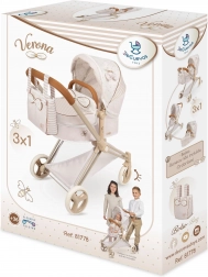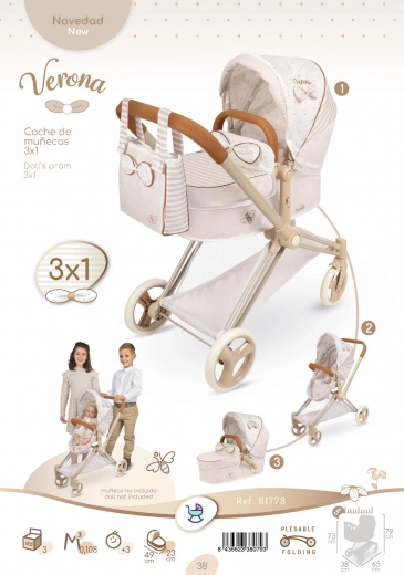 Elegante passeggino per bambole 3 in 1 della collezione VERONA che conquista con il suo delicato design naturale, la struttura pieghevole e la navicella rimovibile trasformabile in versione sportiva. Offre capottina regolabile, cintura a tre punti, ruote anteriori piroettanti per una guida facile e una borsa pratica oltre a un cestello portaoggetti. Ottima scelta per bambini dai 3 anni in su.