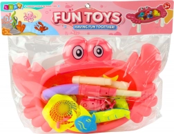 - tavolino a forma di granchio (4 gambe), 10 pesci e creature marine colorati, canna, retino
