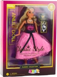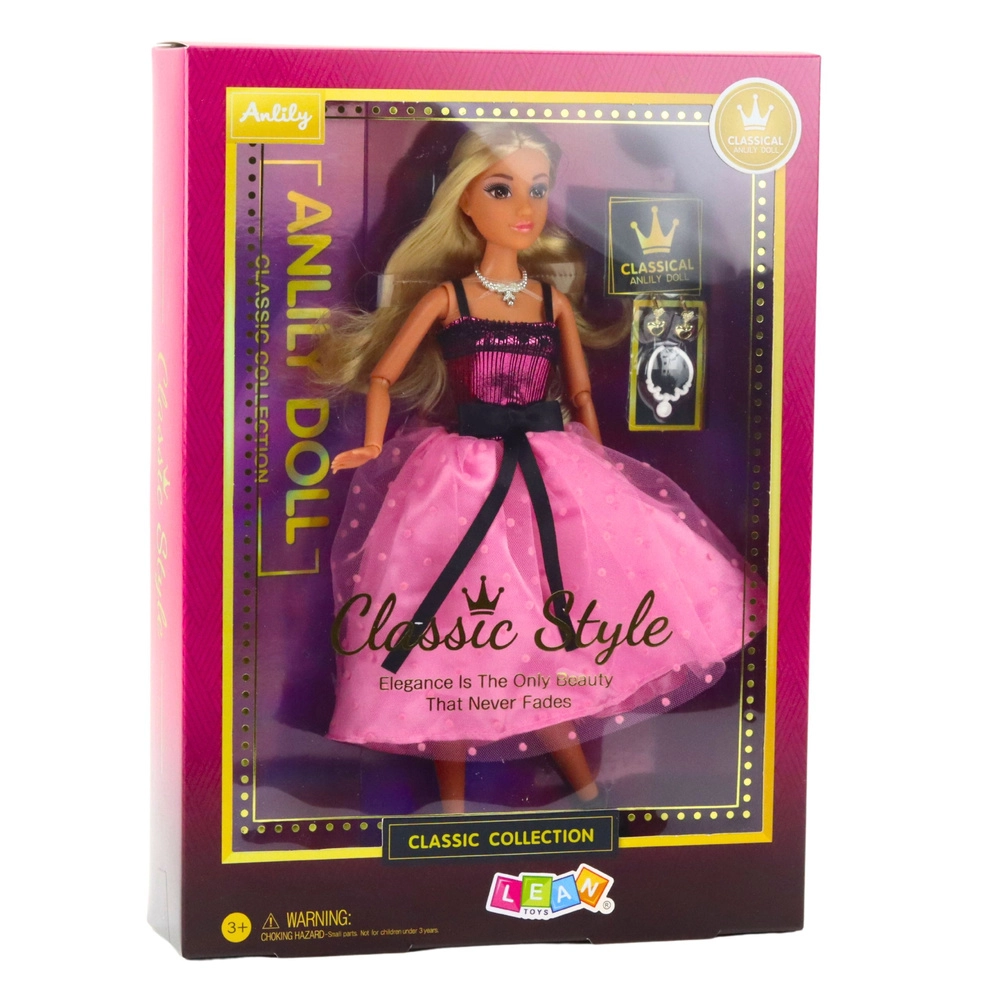 L’elegante bambola ANLILY in abito da sera rosa‑nero farà felice ogni piccola amante della moda. Ha lunghi capelli biondi per creare acconciature, arti snodabili per un gioco realistico e ricchi accessori – collane, orecchini e scarpe nere. Ideale per gioco creativo e storie di stile.