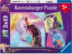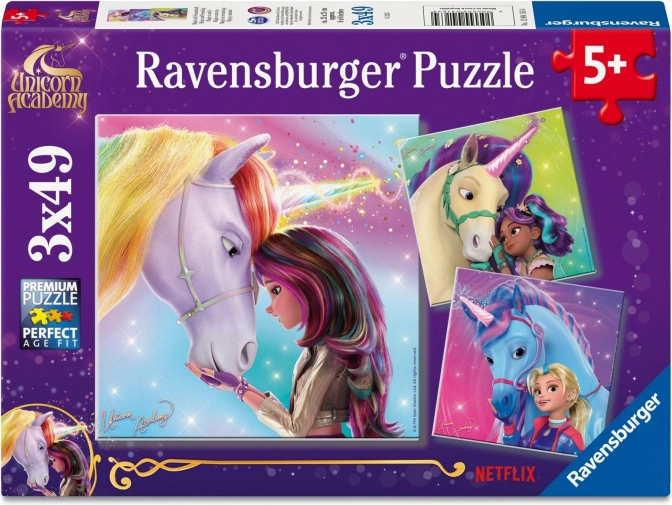 Scopri il mondo magico di UNICORN ACADEMY con il triplo set di puzzle di RAVENSBURGER. Ognuno dei tre puzzle ha 49 pezzi e raffigura gli eroi della storia Accademia degli unicorni in colori vividi e brillanti. Materiali premium e lavorazione precisa garantiscono la soddisfazione di ogni pezzo che va al suo posto.