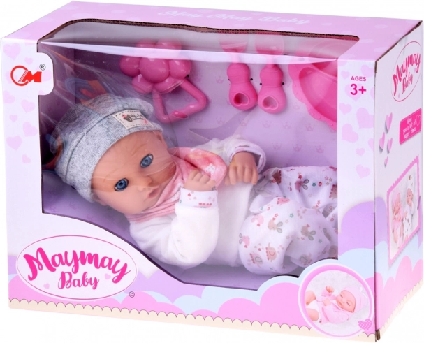 Bambola bebè 32 cm con palpebre mobili e set per la pappa