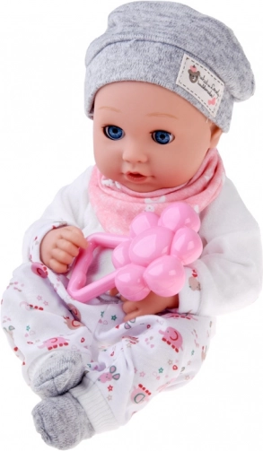Questa bambola è realizzata in materiale morbido e piacevole con testa e mani in plastica per maggiore resistenza. L’outfit in colori delicati include un cappellino grigio, una blusa morbida, pantaloni con fantasia e calzine grigie. Grazie alle palpebre mobili, la bambola imita fedelmente sonno e veglia, incoraggiando la cura naturale e l’empatia.