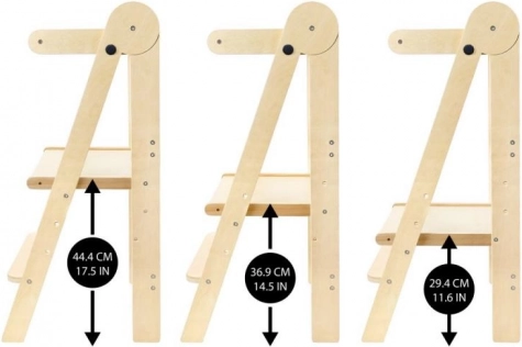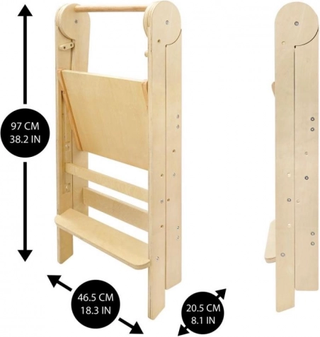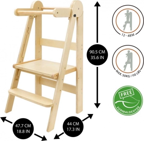 Il design studiato permette ai bambini di salire in sicurezza e in autonomia grazie al gradino a 16 cm di altezza. La torre è pieghevole, si sposta facilmente dalla cucina al bagno e occupa pochissimo spazio quando riposta. Il legno testato non contiene formaldeide, garantendo un materiale sicuro per la salute.