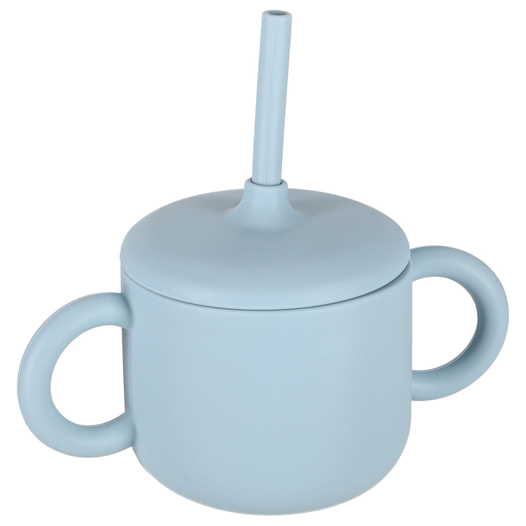 Bicchiere in silicone a due manici con coperchio e cannuccia integrata, facilita il passaggio dal biberon. La superficie morbida non scivola ed è delicata sulle manine.